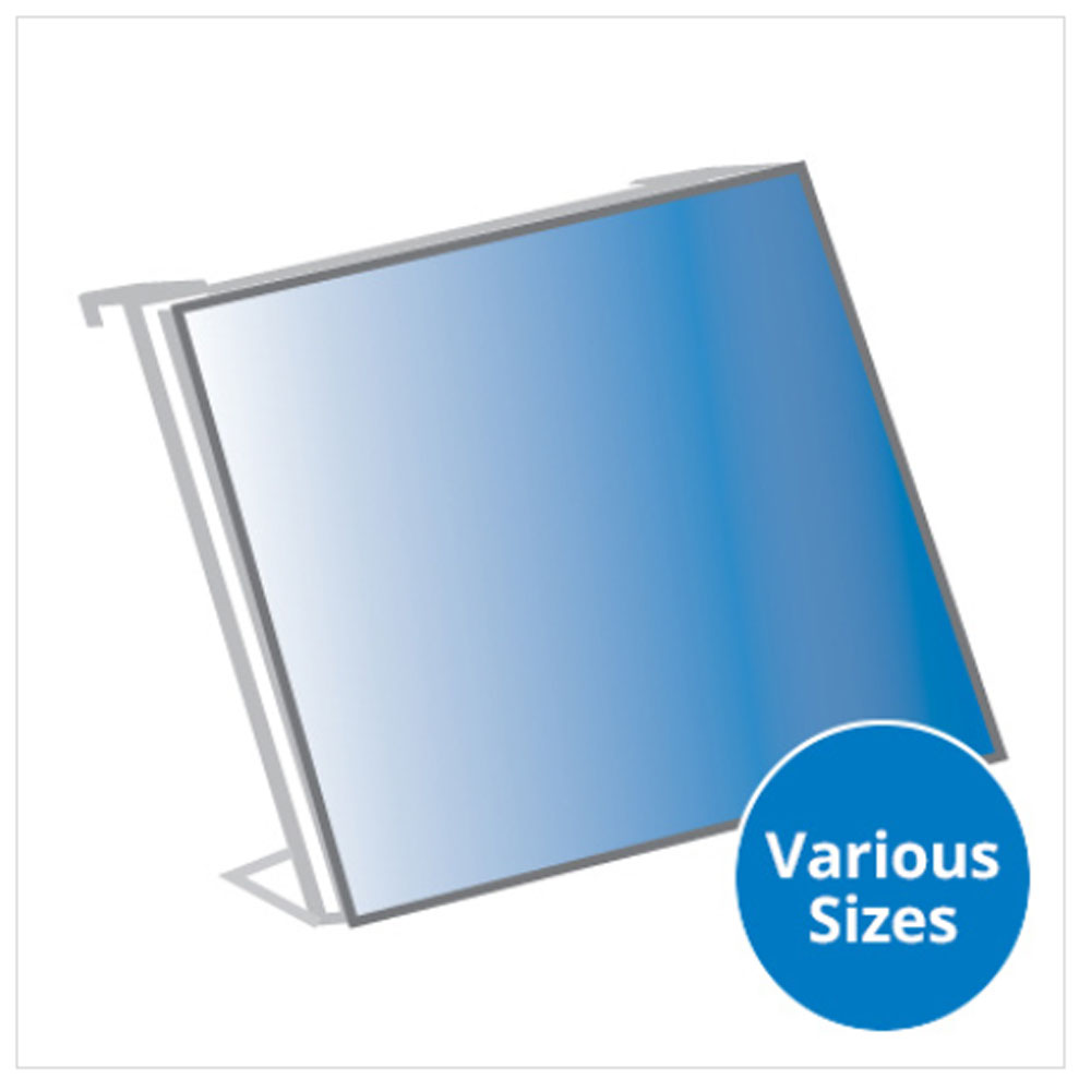 Diamond Edge polished clear acrylic pocket with kickplate to create angled display, Fabricated with hooks to suit 20mm box section (Ladder Lectern Units)